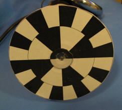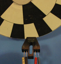 for this test, an old cd covered with this overlay was attached to a variable speed dremel tool (dangerous - keep it under 10000 rpm). the sensor used is a fairchild semi. qrb1114. the ir led is made visible by a digital camera. this overlay produces 10 pulses per revolution so the resolution is 6 rpm.