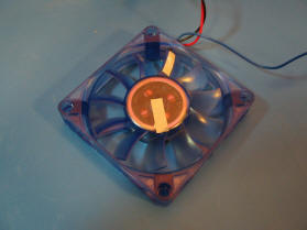 a small 12V fan with hall effect sensor output on blue wire. a series resistor is required to limit the current to the input of the amplifier circuit. (the reflective tape on the fan was used to verify the speed using a laser type tachometer.)