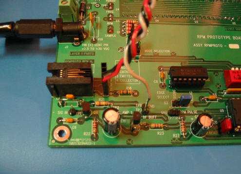 connections to the tachometer board are quiet simple. the power is supplied by the anode and cathode ir led connections and since the output of the encoder is buffered ttl, the first stage of the amplifier circuit can be bypassed by connecting the output to test point 3.