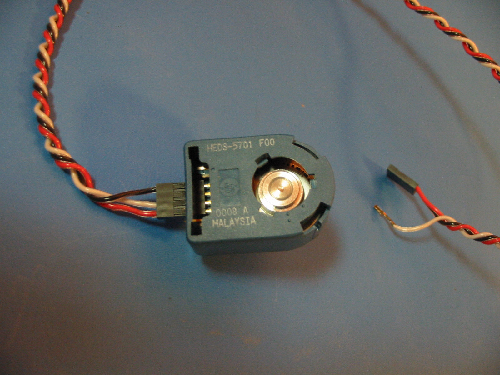 due to the current version of the software, if slow speeds are to be measured, a large number of pulses (per revolution) are required. this rotary encoder made by hp was found on ebay for around $25. it produces a quadrature output of 1024 pulses (grey code) per revolution. if only one channel is used, 256 pulses per revolution is the output. the damping mechanism was removed so the encoder can spin freely.